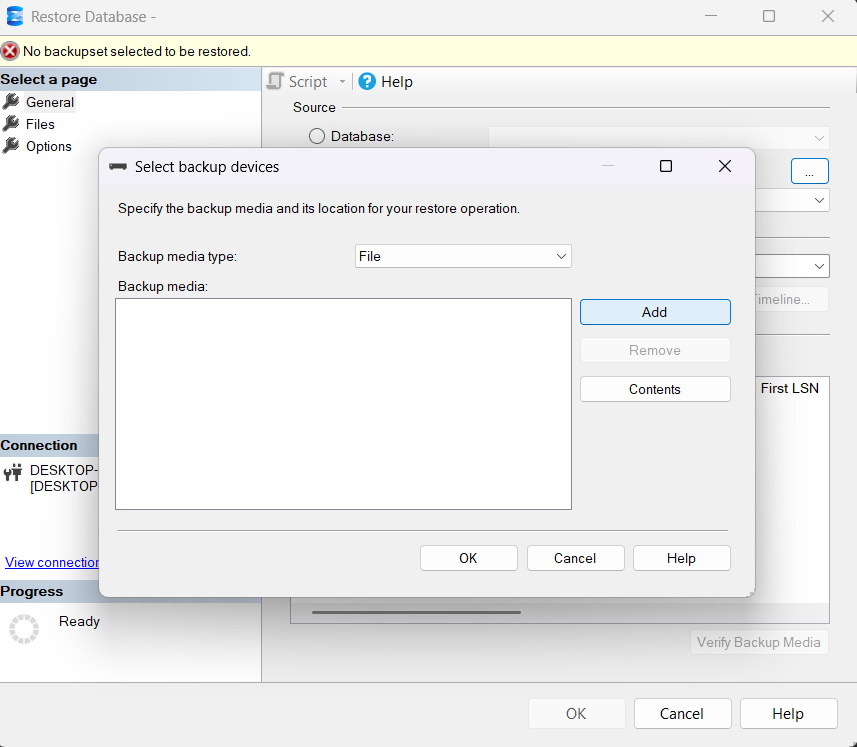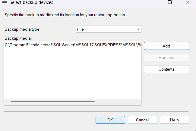 - **Device**: Select this option to browse for your AdventureWorks .bak file