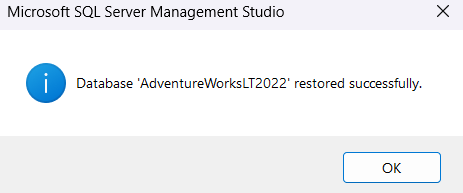 Once all settings are configured, click OK to begin the restoration process. SQL Server will display a progress bar, and upon successful completion, you'll see a confirmation message.