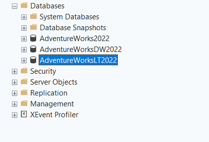 After restoration completes, expand the Databases folder in Object Explorer to confirm that AdventureWorks appears in the list. You can run a simple query to verify the data: