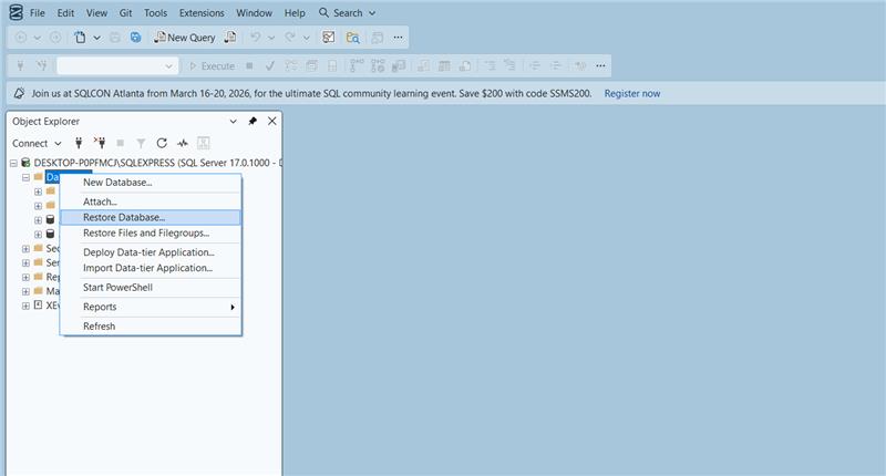In Object Explorer, right-click on the **Databases** folder and select **Restore Database** from the context menu. This opens the Restore Database dialog box.